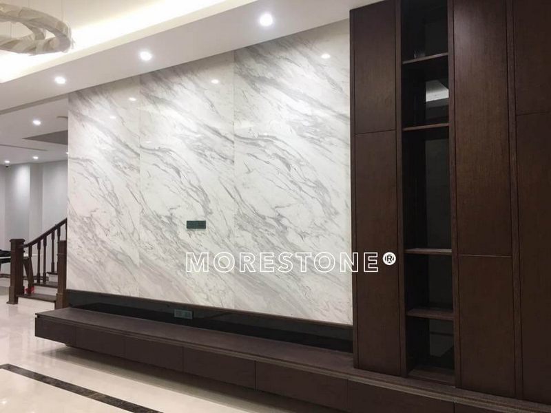 Vách tivi được thiết kế bằng đá tự nhiên ốp tường màu trắng hiện đại và có phong cách sang trọng.