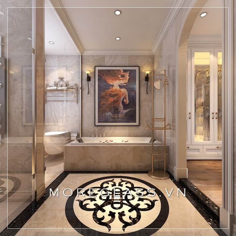 Một trong những ứng dụng độc đáo của đá granite là dùng làm vách ngăn hoặc ốp tường phòng tắm. Bề mặt bóng loáng của đá không chỉ dễ vệ sinh mà còn tạo cảm giác rộng rãi và thoáng đãng. Đặc biệt, khi kết hợp với ánh sáng phù hợp, các đường vein tự nhiên trên viên đá sẽ trở thành tâm điểm thu hút mọi ánh nhìn, khiến phòng tắm trở thành một nơi thư giãn tinh tế sau một ngày dài căng thẳng.